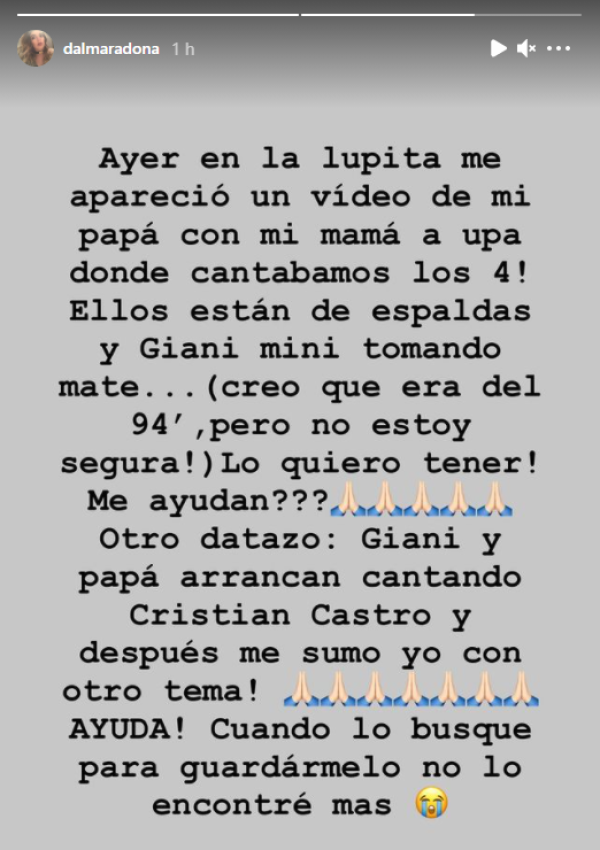“¡Lo quiero tener! ¿¿¿Me ayudan???”, agregó con un pedido para su más de un millón y medio de seguidores en la plataforma. “Otro datazo: ¡Giani y papá arrancan cantando Cristian Castro y después me sumo yo con otro tema! ¡Sale AYUDA! Cuando lo busqué para guardármelo, no lo encontré más”, concluyó Dalma Maradona.