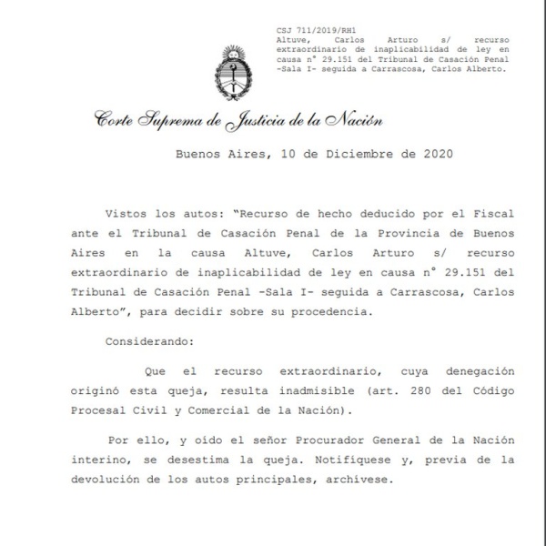 “El recurso extraordinario, cuya denegación originó esta queja, resulta inadmisible”, afirmó el máximo tribunal en un breve escrito en donde aplicó el artículo 280 del Código Civil y Procesal de la Nación con las firmas de los jueces Lorenzetti, Maqueda, Rosenkrantz y Rosatti. El artículo asegura que “cuando la Corte Suprema conociere por recurso extraordinario, la recepción de la causa implicará el llamamiento de autos. La Corte, según su sana discreción, y con la sola invocación de esta norma, podrá rechazar el recurso extraordinario, por falta de agravio federal suficiente o cuando las cuestiones planteadas resultaren insustanciales o carentes de trascendencia”.