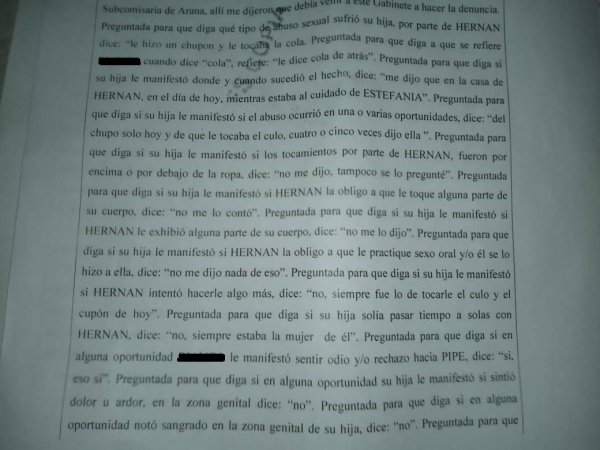 “No solo está lacra humana le había hecho un chupón en el cuellito sino que también la más chica confiesa que le había mordido la cola, por otro lado la más grande cuenta que en reiteradas ocasiones la acostada en la cama y le hacía "cosquillas" él estando en calzoncillos. Su pareja fue testigo de todo lo que ocurría y nunca dijo ni hizo absolutamente nada, teniendo ella una hija de la misma edad que las nenas, lo que la convierte en una cómplice de todo el daño ocurrido”, disparó con bronca la tía de las nenas.