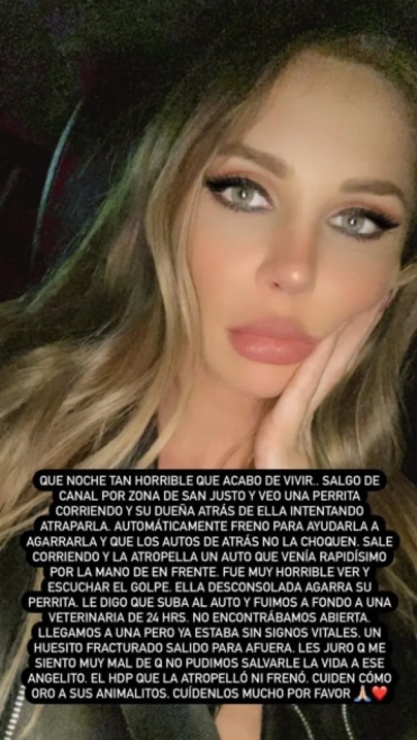 "Que noche tan horrible acabo de vivir... Salgo del canal por zona de San Justo y veo una perrita corriendo y su dueña atrás de ella intentando atraparla. Automáticamente freno para ayudarla a agarrarla y que los autos de atrás no la choquen. Sale corriendo y la atropella un auto que venía rapidísimo por la mano de en frente. Fue muy horrible ver y escuchar el golpe", comenzó a describir en sus historias.