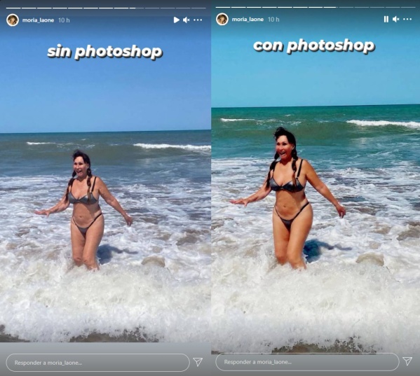 Pero momentos después, se animó a más y se mostró sin Photoshop dentro del mar con una bikini negra perlada. En la foto que subió a sus historias se la puede ver con mucha energía, alegre y divertida saltando las olas.