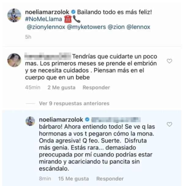 Indignada y filosa, Noelia le respondió con todo: “Se ve que las hormonas a vos te pegaron como la mona. Onda agresiva. Qué feo. Disfrutá más genia. Estás rara, demasiado preocupada por mí cuando podrías estar mirando y acariciando tu pancita sin escándalo”.