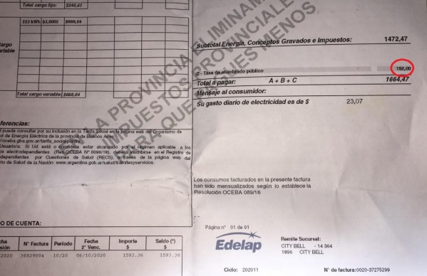 Hasta el momento, los vecinos platenses pagan un cargo fijo de 192 pesos, que es el que aparece en las boletas de luz de EDELAP.