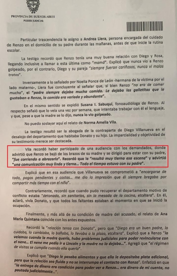 Por su parte, Andrea Llera, encargada del cuidado de Renzo en el domicilio del padre, también se expresó en el mismo sentido. “Siempre fueron cariñosos, nunca vi malos tratos”, dijo en referencia a Diego Villanueva y su pareja Rosa. “Renzo no era de comer mucho; el padre siempre le dejaba mucha comida. Le dejaba las galletitas que le gustaban a Renzo, la comida era variada y abundante”, agregó Llera.