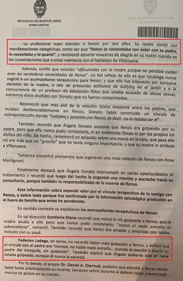 Uno de esos testimonios es el de la psicóloga de Renzo, Florencia Uzubiaga, quien afirmó que “Renzo se contentaba con estar con su padre, lo necesitaba y lo quería”. Y reconoció advertir “muestras de alegría” cuando el pequeño veía a su padre.
