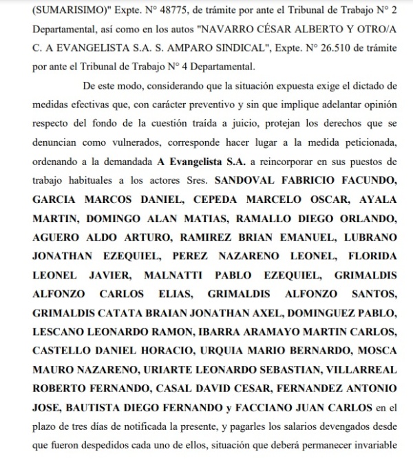 Cabe recordar que semanas atrás se había conocido un fallo similar, donde se exigía la reincorporación de otros 9 trabajadores echados.