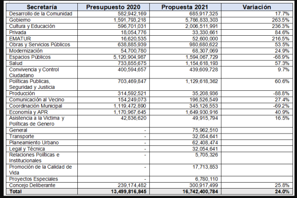 Este miércoles, después de una larga sesión y tras un debate dividido, se aprobó el Presupuesto Municipal para el 2021. El proyecto fue aprobado tras los votos del oficialismo en su totalidad y el concejal del GEN Gastón Crespo a Favor. Por su parte, toda la oposición votó en contra. De esta manera, la votación de los 24 concejales quedó en un 14 a 10 a favor del nuevo presupuesto.