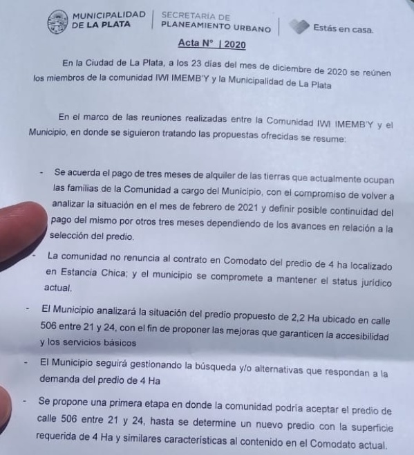 “El 26 de febrero del año 2019, el Intendente municipal de La Plata, cumpliendo la decisión de la Defensoría del Pueblo Nacional, que invocó la ley 26160 de relevamiento territorial de comunidades, cedió mediante un contrato de comodato por 99 años a nuestra Comunidad originaria Ava guaraní, “Iwi imb´y” una superficie de 41254.34 m2 de tierra en la localidad de Abasto. (calle 38 e/ Ruta 36 y calle 36). Este contrato fue ratificado por el consejo Deliberante el 15 de octubre de 2020 según expediente 69989”, explicaron a través de un comunicado.