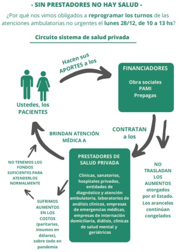La Federación Argentina de Prestadores de Salud (FAPS) informó que, como consecuencia de la grave crisis económica que atraviesa el sector, el lunes 28 de diciembre las instituciones de salud privada de todo el país se verán obligadas a reprogramar prestaciones ambulatorias entre las 10 y las 13 horas.