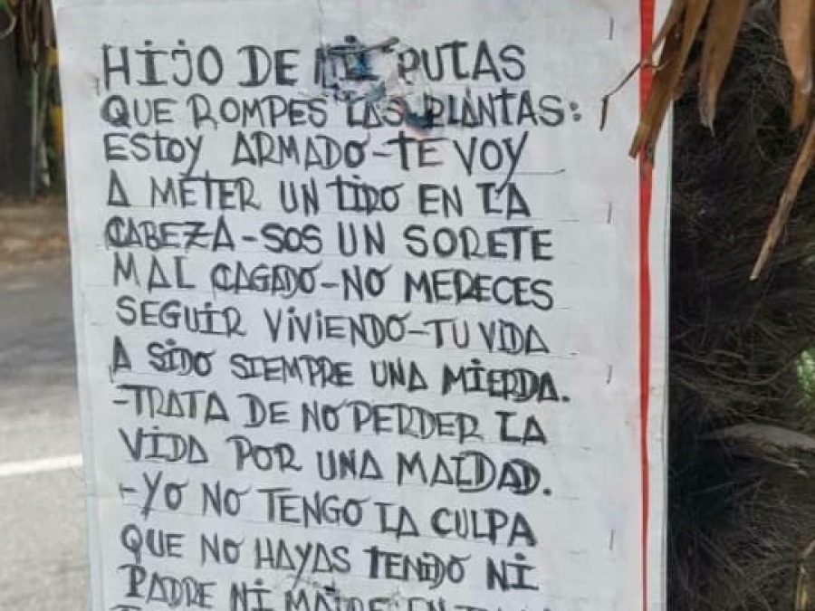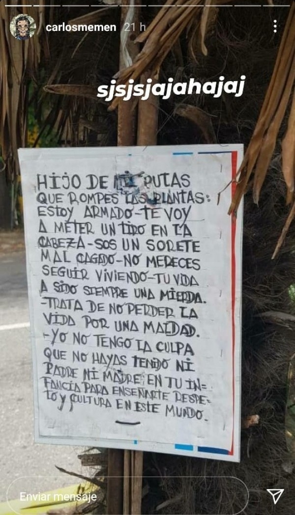 Al cartel lo dio a conocer el influencer de La Plata "Carlos Memen" en su cuenta de Instagram, y se convirtió en furor en la ciudad. Se trata de un vecino que vive sobre la calle 44, y se mostró más que harto con la gente que rompe las plantas del lugar.