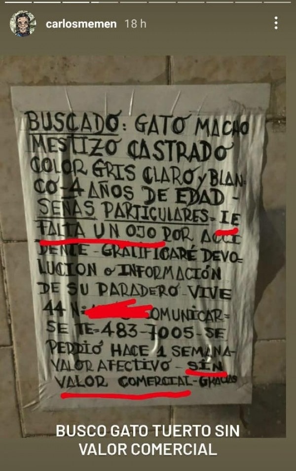 Se puede identificar que el creador de los dos carteles es el mismo, debido a que se trata de la misma caligrafía. En este último, denuncia que se busca a un gato. Pero lo que más llama la atención es la deducción que saca al decir que "no tiene valor comercial", ya que se trata de un gato sin un ojo.