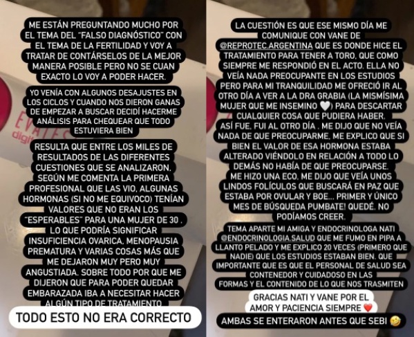 "Me están preguntando mucho por el tema del ‘falso diagnóstico’ con el tema de la fertilidad y voy a tratar de contárselos de la mejor manera posible, pero no sé cuán exacto lo voy a poder hacer", empezó relatando. "Yo venía con algunos desajustes en los ciclos y cuando nos dieron ganas de empezar a buscar, decidí hacerme análisis para chequear que estuviera todo bien", explicó.