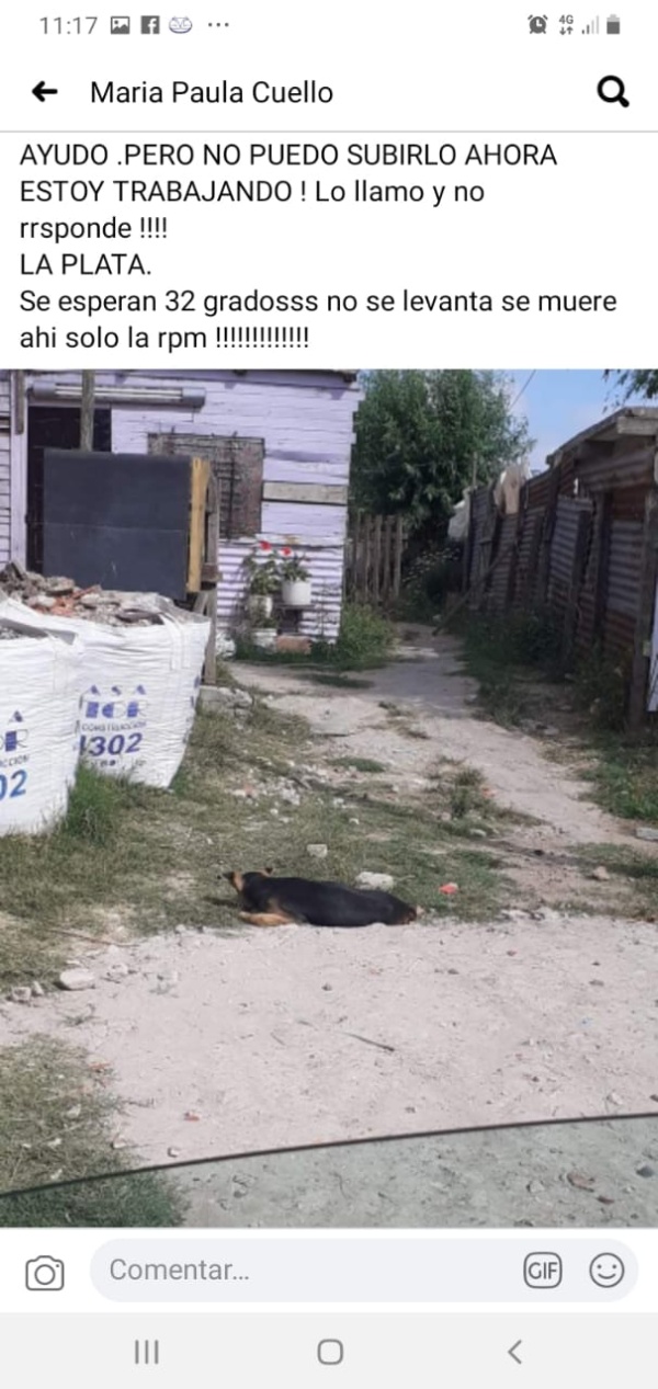 “No conseguía traslado para llevarlo hasta 67 entre 157 y 158 (veterinaria Islas Malvinas); me pasó la alerta una amiga temprano a las 10 porque ella estaba trabajando; hablé con la veterinaria que estaba a 8 cuadras de donde se encontraba la perra porque necesitaba un traslado. Nadie se ofreció, ningún vecino, ni siquiera de la casa que se ve en la imagen. No se podía parar y murió al rayo del sol, con 32 grados”, precisó Claudia en diálogo con LAPLATA1.com.