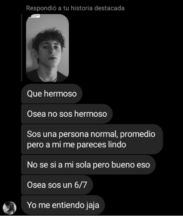 "Qué hermoso. O sea, no sos hermoso. Sos una persona normal, promedio, pero a mí me parecés lindo. No sé si a mi sola pero bueno. O sea, sos un 6 o un 7. Yo me entiendo", le dijo una usuaria en la red social y claro, él decidió compartirlo en Twitter bajo la leyenda "Chamuyo a marzo" y fue viral. ¡Mirá!