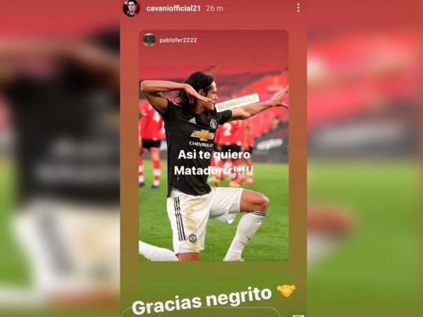 El 29 de noviembre, poco después de una remontada ante el Southampton, Cavani respondió al mensaje de un seguidor con la frase en español "gracias negrito".