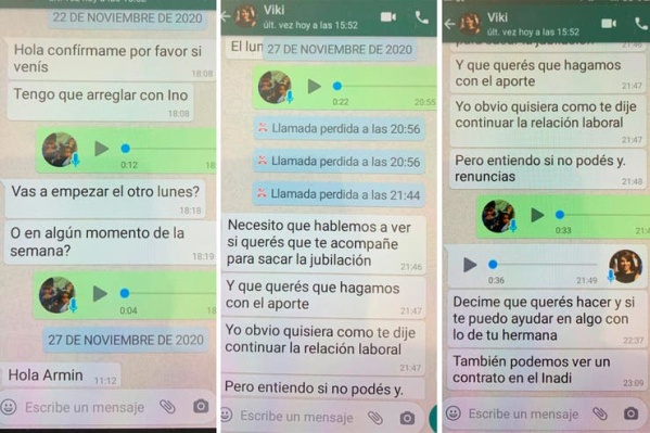 "Esta cadena de mensajes demuestra cómo la señora Victoria Donda utiliza la influencia y los recursos públicos que administra en el ejercicio de su función para resolver sus cuestiones particulares de su esfera privada para tratar de resolver sus incumplimientos personales como empleadora", abundó el letrado, "y para tratar de minimizar los impactos económicos que le generaría un reclamo laboral de una persona que no fue registrada regularmente desde hace muchos años".
