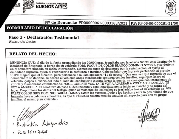“Fui agredido por el delincuente Pablo Ezequiel Ingrassia, íntimo amigo, empleado y compañero de los responsables políticos de la agrupación opositora 11 de Agosto. Me encontraba volviendo de la clínica La Ribera a la cual me acerco por una urgencia y, me detuve por el semáforo en rojo de la cervecería ‘La Fábrica’. Allí, fui increpado primero verbalmente por el nefasto personaje Pablo Ingrassia, quien se acerca a la ventanilla de mi auto para continuar con sus acciones violentas hacia mi coche”, describió el concejal a través de sus redes sociales.