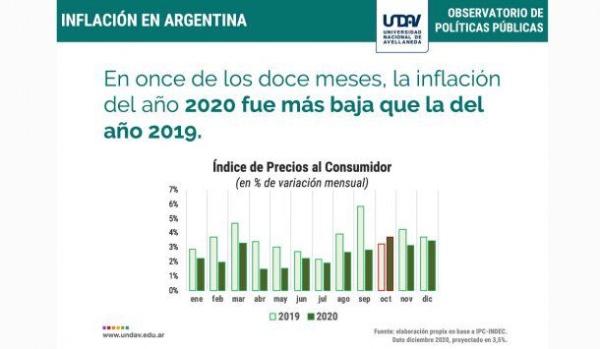 Un informe del Observatorio de Políticas Públicas de la Universidad Nacional de Avellaneda (UNDAV) reveló que en 2020 se logró una reducción de aproximadamente 18,4 puntos porcentuales en materia de inflación en relación a 2019. La tasa de inflación interanual cerrará en torno al 35,5%, suponiendo 3,5% de inflación intermensual en diciembre.