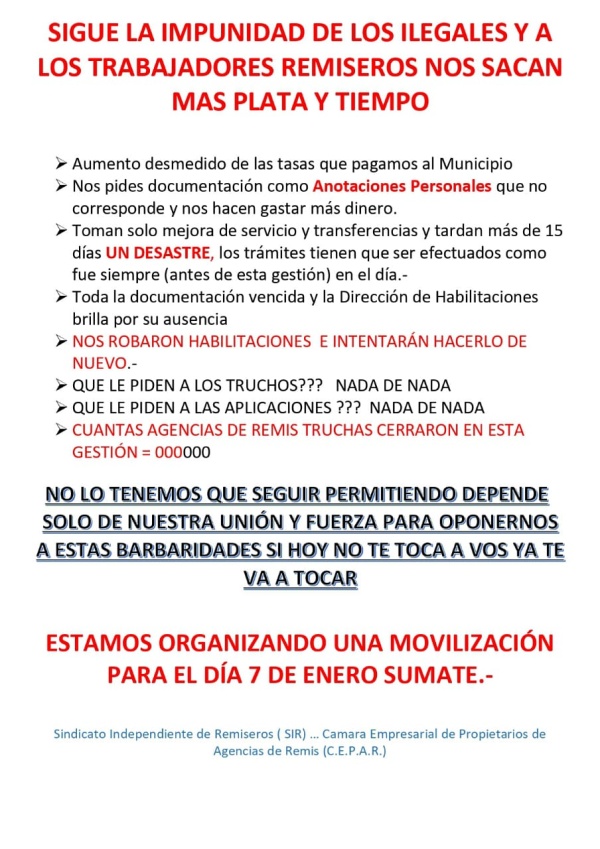 Además de la CEPAR, a la manifestación también convoca el Sindicato Independiente de Remiseros. Su titular, Javier Scaramutti, apuntó contra el nuevo titular de la Dirección de Habilitaciones, Emiliano Calana, a quién tildó de “soberbio”.
