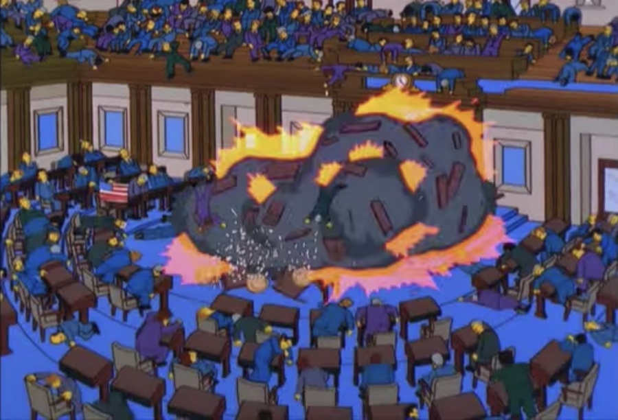 Concretamente, estos hechos se pueden ver en el primer capítulo de la temporada 11, titulado “Más allá de la cúpula del fracaso”. En el episodio, estrenado el 26 de septiembre de 1999, el padre de la familia más conocida de la televisión daba ideas sobre una película en la que se saqueaba el Capitolio.