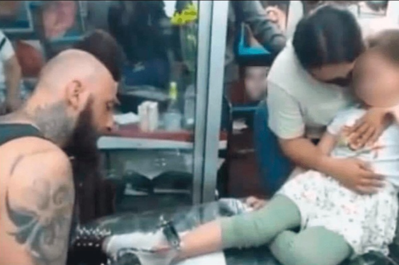 En la filmación, se ve cómo la mujer obliga a su niña a realizarse un dibujo de una flor en su pierna derecha y la sostiene de de su cuello mientras el tatuador lleva a cabo su labor.