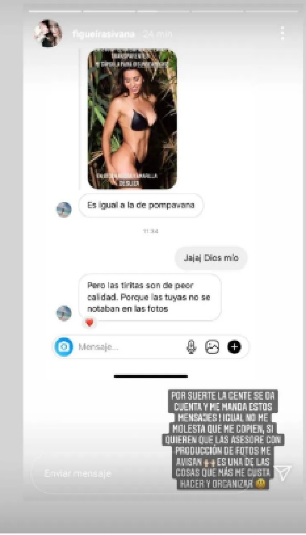La propia Ivana compaetió las fotos en su cuenta de Instagram mostrando su descontento pero reveló: "Por suerte, la gente se da cuenta y me manda estos mensajes. Igual no me molesta que me copien, si quieren que las asesore con producción de fotos me avisan. Es una de las cosas que más me gusta hacer y organizar".