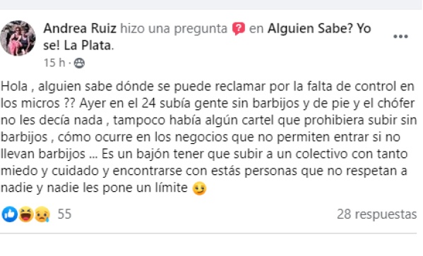 En este sentido, en las redes sociales mostró su enojo: “¿Alguien sabe dónde se puede reclamar la falta de control en los micros? Ayer en el 24 subía gente sin barbijos y de pie, y el chofer no les decía nada”, sostuvo.