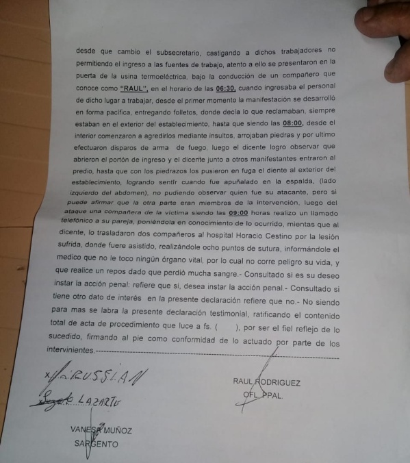 Juan José cree que hubo complicidad de la seguridad de la Usina para permitir el ataque a los trabajadores de la UOCRA, que se manifestaban en el lugar para visibilizar la discriminación que sufren desde hace casi cuatro años por estar referenciados con el Pata Medina.
