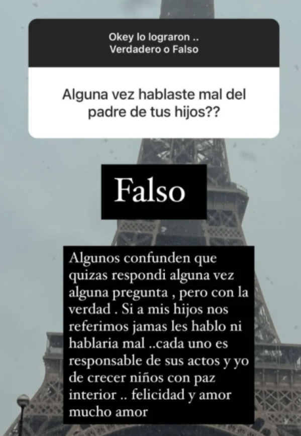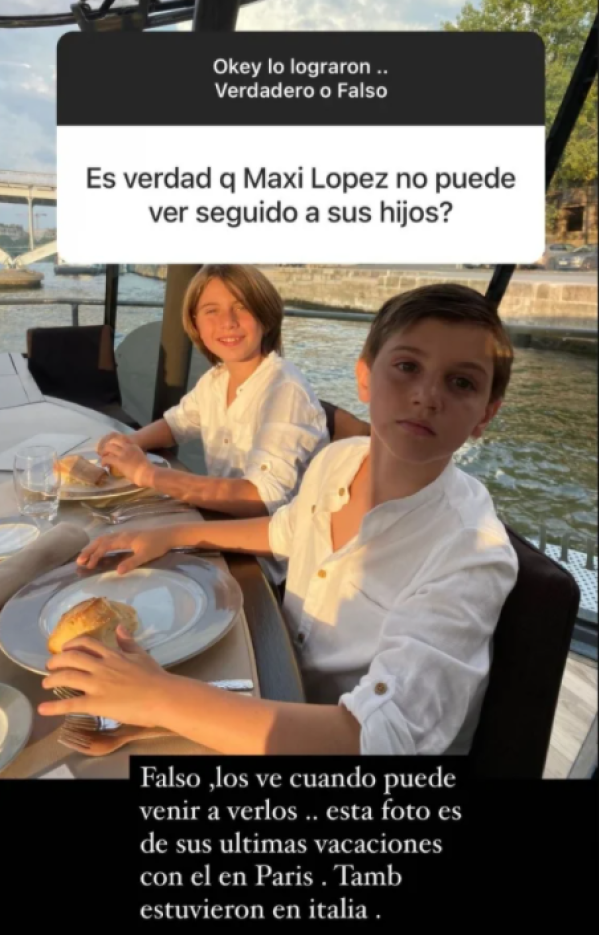 Sin esquivar a la pregunta sobre su exesposo, con quien tiene a Valentino, Constantino, Benedicto, Wanda contestó a la siguiente consulta: “¿Es verdad que Maxi López no puede ver a sus hijos?”. A lo que ella respondió: “Falso, los ve cuando puede venir a verlos. Esa foto (la que acompañó su texto) es de sus últimas vacaciones con él en París. También estuvieron en Italia”.