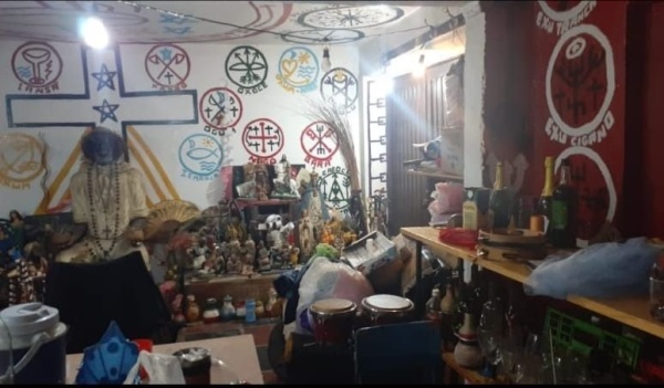 Cruces y símbolos pintados en las paredes, estatuas Umbanda y de San La Muerte, y demás elementos ritualísticos colmaban una de las habitaciones de la vivienda.