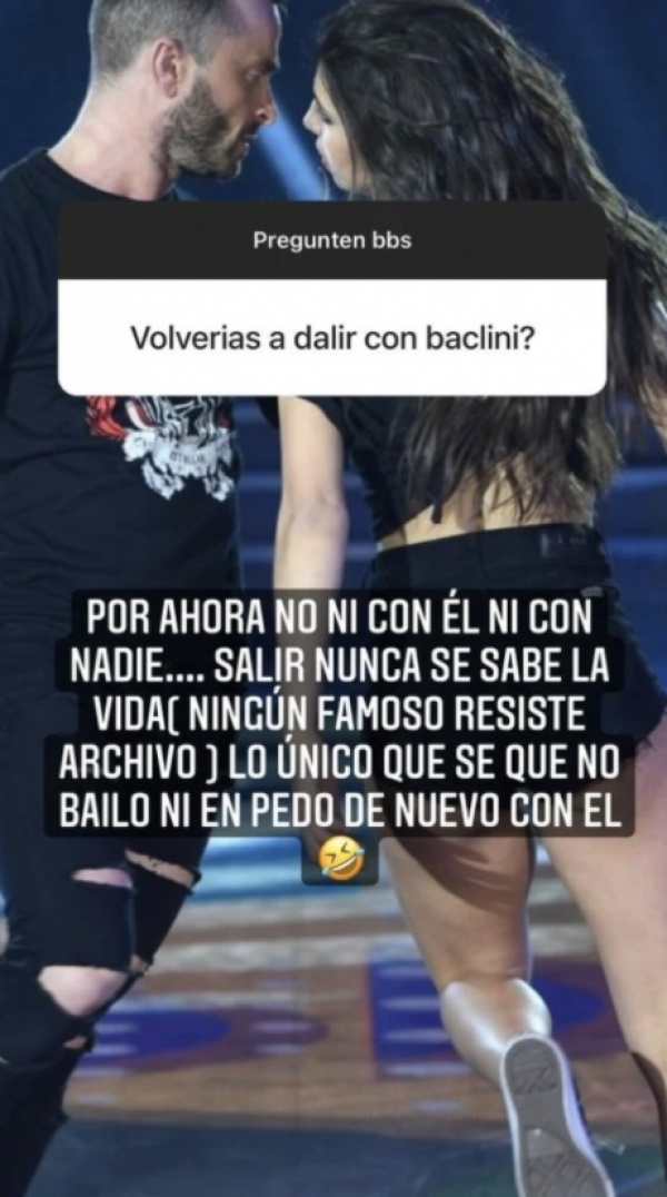 "Salir nunca se sabe en la vida (ningún famoso resiste un archivo). Lo único que sé es que no bailo ni en pe... de nuevo con él", sentenció.