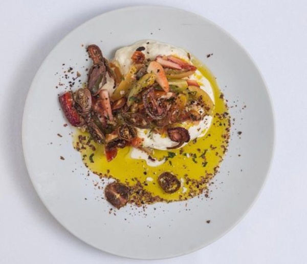 Siguiendo con la línea, en su menú para las fiestas también incluyó burrata. Esta vez en dos opciones, la primera con texturas de tomate y la segunda con tomate confitado, crocante de frutillas y alcaparras.