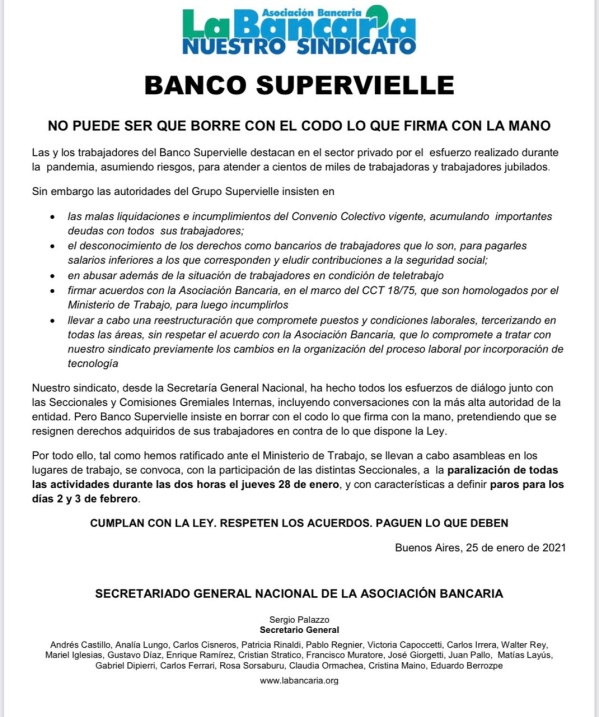 Desde el gremio La Bancaria confirmaron que este jueves habrá un paro de dos horas en todas las sucursales del país de Supervielle.