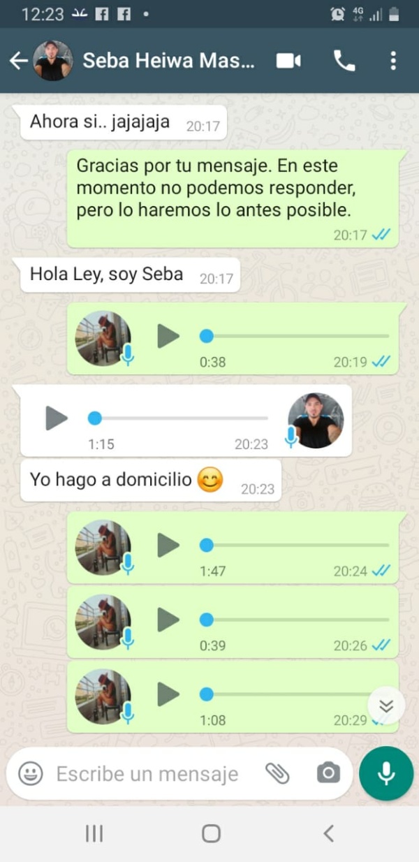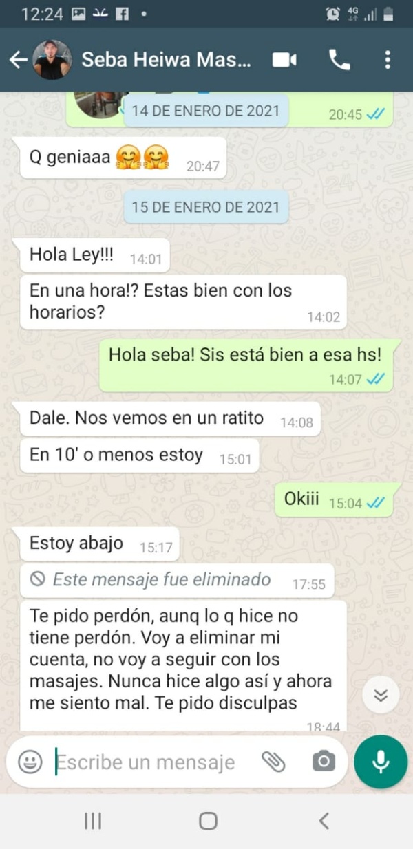 "El jueves esta persona me contacta vía WhatsApp a través de sus redes sociales de masajista. Yo no sabía quién era así que mantuve un trato distante al principio hasta que me dijo que era un conocido, amigo de una amiga, que había visto en un cumpleaños hacía varios meses atrás. Me ofrece sus servicios como masajista, contándome que necesitaba trabajar, que si podía hacerle difusión desde mis redes sociales, o hacer sorteos, en ese momento yo hacía mi programa de radio, le dije que estaba al aire. Empezamos a tener comunicación desde ese entonces, coordinamos en que pase el jueves por mi casa. Me dijo que estaba cerca de mi casa".