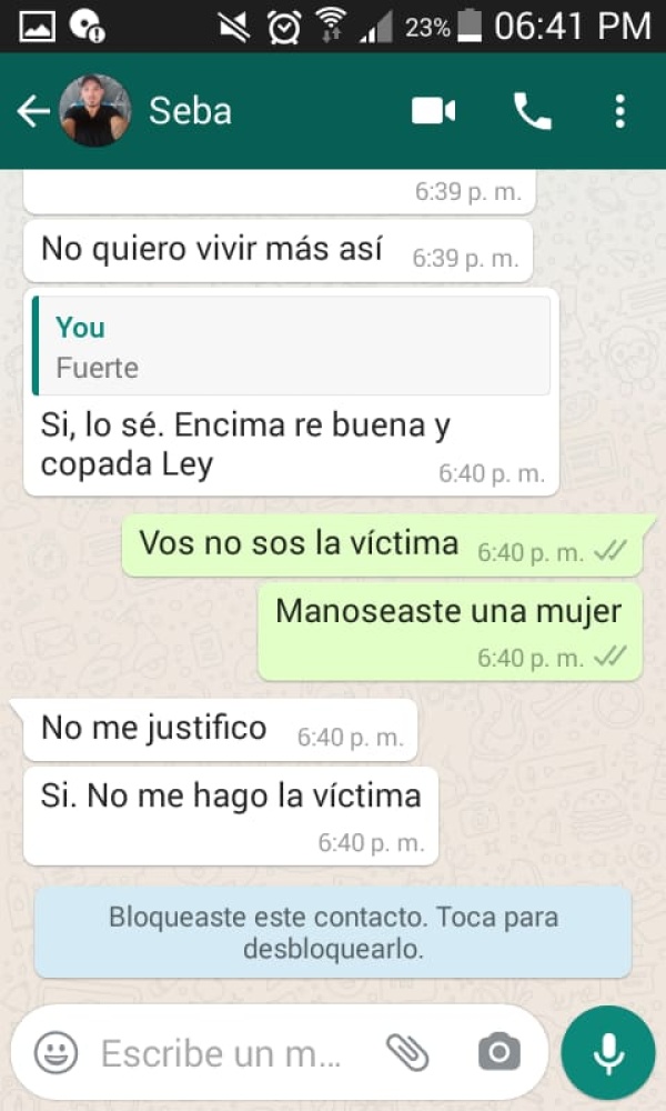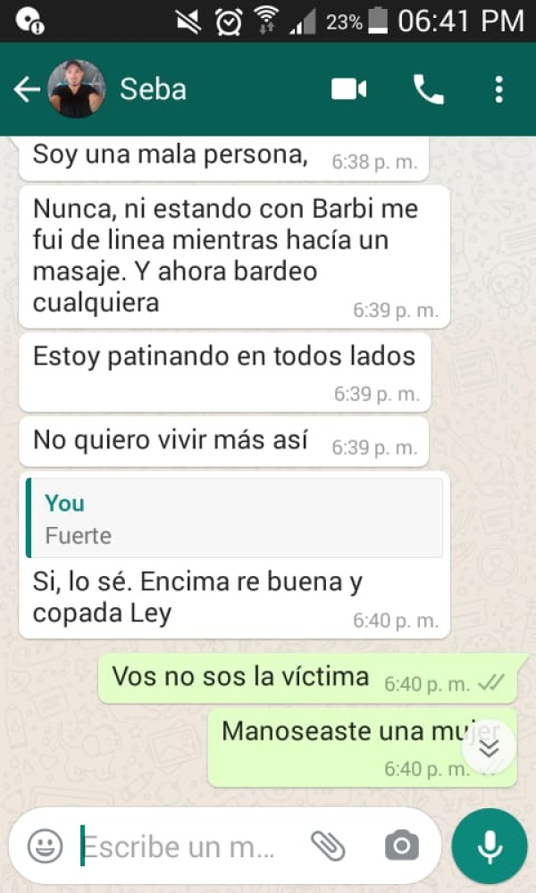 "Mientras le contestaba a mi amiga me escribe a mi, me pasa las fotos que me había sacado, yo vi el mensaje y no lo podía creer. Obviamente lo que me mandó mi amiga yo lo tengo guardado. Entonces él me manda unas disculpas vía WhatsApp y no le contesté ni un mensaje. En el momento sentí un bloqueo absoluto, no pude reaccionar. Lo único que quería era sacarlo de mi casa. Se fue y empecé a contactar a una amiga que tenemos en común y le pregunté si ella conocía bien a esta persona. Le conté lo que pasó, le pedí sus datos porque iba a ir a hacer la denuncia. Élla le escribió, y él le contó que había hecho algo muy malo, que no merecía vivir y que venía haciendo las cosas mal".