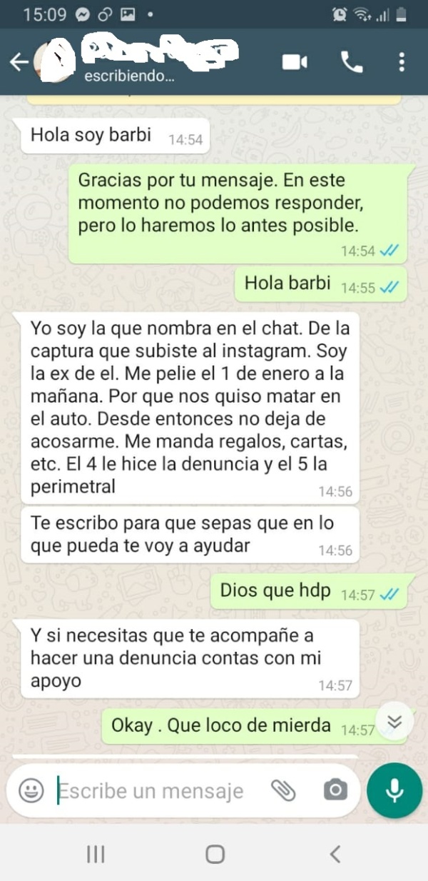 "Ese mismo día a las 11 de la noche recibo otro mensaje de esta persona, no ingresé al mensaje, hice una captura en las notificaciones y me dijo que se iba a presentar en la DDI. Y después me apareció que esta persona había borrado esos mensajes. Al día de hoy eso quedó todo en la Fiscalía 7 y estoy a la espera de que haya alguna novedad porque esta persona, hasta ayer, seguía libre. Estoy a la espera de que hagan algo. Se comunicó una ex novia de él ya que este sujeto la intentó matar y tiene una perimetral, y se trata de dos causas distintas. Esta es una persona que ya tiene antecedentes de violencia y estaría bueno que esta persona no siga suelta porque puede seguir haciendo lo mismo o algo peor".
