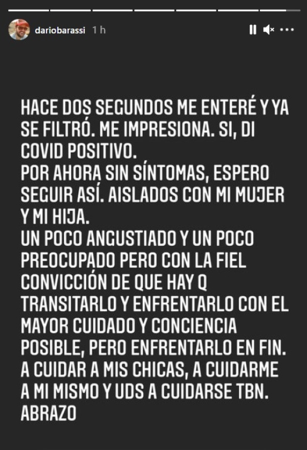 "Hace dos segundos me enteré y ya se filtró. Si, di covid positivo. Estoy un poco angustiado y un poco preocupado pero con la fiel convicción de que hay que transitarlo y enfrentarlo con el mayor cuidado y conciencia posible, pero enfrentarlo en fin", escribió en su Instagram.