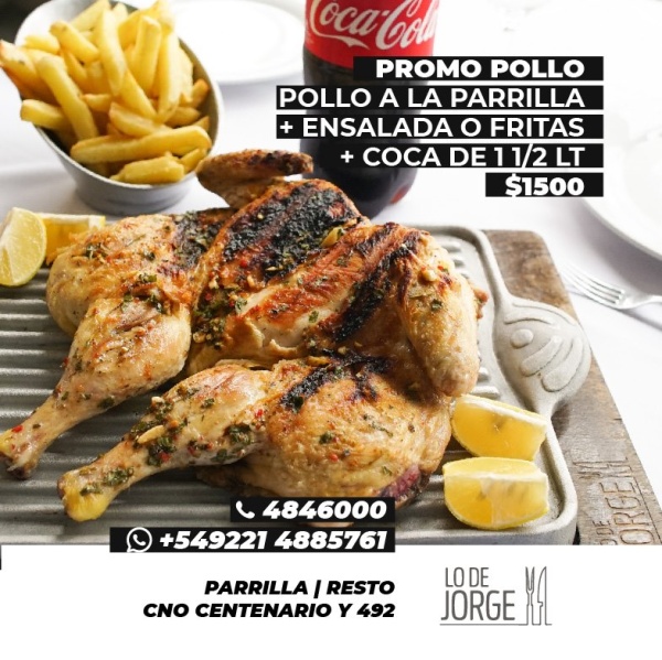 La parrilla Lo de Jorge, además de tener el asado más rico de la ciudad, tiene el pollo a la parrilla por excelencia. A diferencia de las parrillas tradicionales de pollo, venden pollos grandes con sabor a leña y promos más que atractivas que incluyen papas fritas o ensaladas y una bebida. Si bien el precio es más elevado que el resto, vale la pena pagarlo ya que se compensa con el tamaño y calidad del pollo. Con atención rápida, cuenta además con un luminoso salón para almorzar o cenar. También cuenta con comidas para llevar y delivery.
