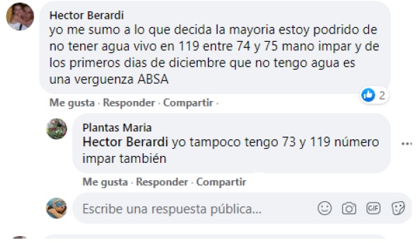 En este sentido, una frentista de ese barrio también vive ese problema: "Yo tampoco tengo. Vivo en 73 y 119 número impar también".