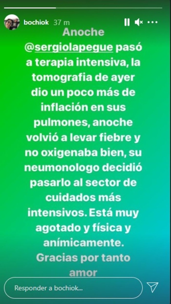 "Anoche Sergio Lapegüe pasó a terapia intensiva. La tomografía de ayer dio un poco más de inflación en sus pulmones, anoche volvió a levar fiebre y no oxigenaba bien", indicó la mujer del periodista.