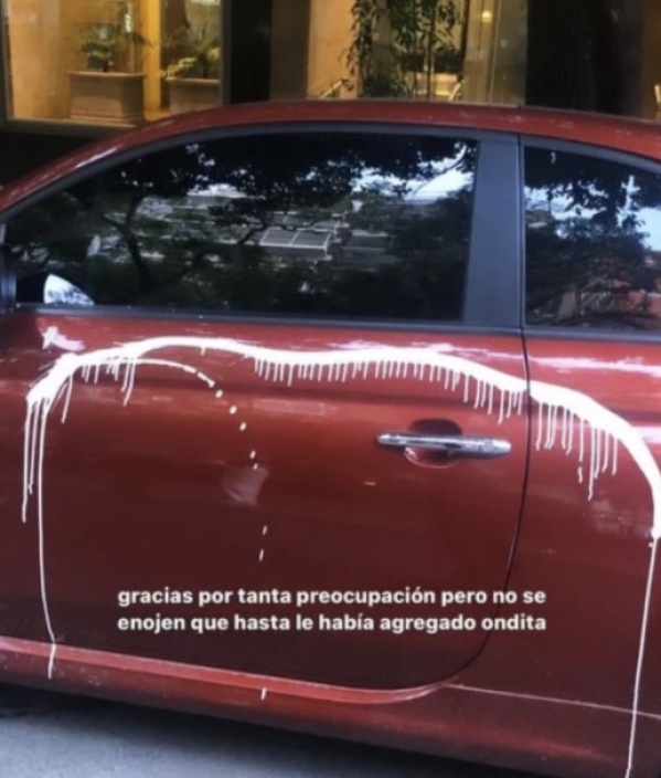 Lejos de ofenderse o enfurecerse, la joven le sacó dos fotos al auto pintado, las compartió a través de sus stories de Instagram y contó que pese a la incómoda situación se siente tranquila, sin ánimos de seguir alimentando el conflicto.