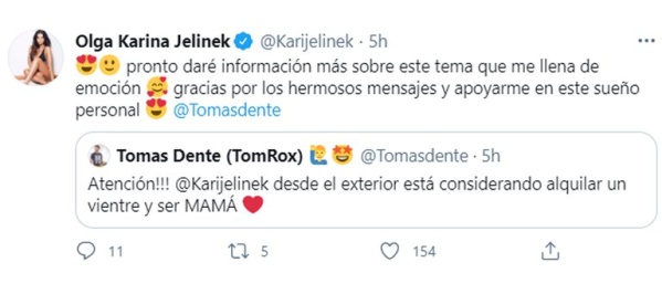 El siguiente capítulo finalmente llegó esta tarde, y tuvo lugar en otra red social. Todo surgió a partir de un tuit del periodista Tomás Dente que volvió a poner sobre la mesa el deseo de Karina de ser mamá: “Atención!!! Karina Jelinek desde el exterior está considerando alquilar un vientre y ser MAMÁ”, escribió el conductor de Vino por vos (KZO) en la red del pajarito, arrobando a la modelo.