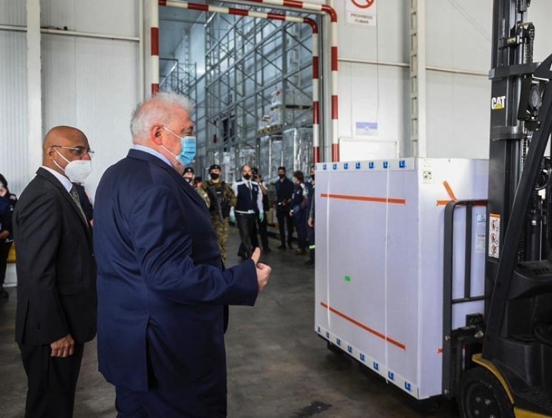 Las dosis de la marca Covishield, producidas por el laboratorio Serum Institute de la India y desarrolladas por la Universidad de Oxford y AstraZeneca, fueron descargadas en la Terminal de Cargas del aeropuerto para su posterior distribución.