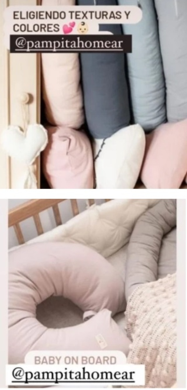 La modelo subió algunas postales a las redes donde se ve algunos muebles decorados con tiernos muñequitos, además de varias formas de almohadones que estarán en la cuna con distintos tonos de colores en los almohadones.