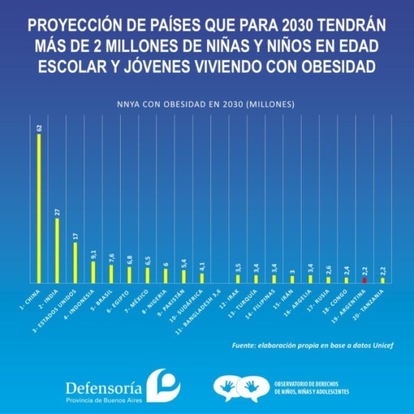 Es uno de los 20 países en el mundo que, según las proyecciones de Unicef, en el año 2030 podría superar los 2 millones de niños, niñas y adolescentes con elevados índices de masa corporal. Así lo advirtió el Defensor del Pueblo Adjunto de la provincia de Buenos Aires, Walter Martello. El covid-19 agravó la situación.