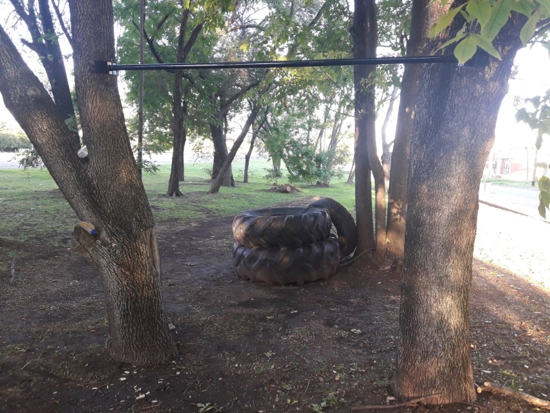 Quienes se adjudican la propiedad de ese espacio público es el grupo "Calistenia y street workout - Team 10 y 524". Dejaron varias cubiertas de camión atadas con una cadena, las cuales se llenaron de agua con las últimas lluvias, y son un criadero de mosquitos.