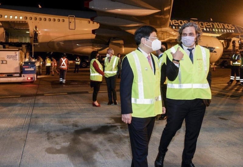 El vuelo fue recibido por el jefe de Gabinete, Santiago Cafiero; la ministra de Salud, Carla Vizzotti, el canciller Felipe Solá y el embajador chino en el país, Zou Xiaoli.