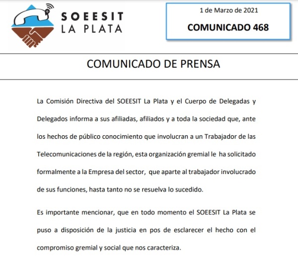 Tras el caso de público conocimiento sobre un operario de telecomunicaciones de Berisso que fue acusado de abuso hacia una nena de 11 años, el Sindicato de Obreros, Especialistas y Empleados de los Servicios e Industria de las Telecomunicaciones (SOEESIT) confirmó que han solicitado que se "aparte al trabajador".