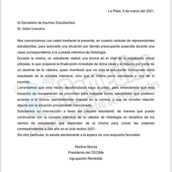 La profesora se enojó por una broma y decidió cancelar la cursada. Los alumnos afectados acudieron al Centro de Estudiantes, conducido por Remediar, quienes elevaron una nota al Secretario de Asuntos Estudiantiles Isidro Lescano.