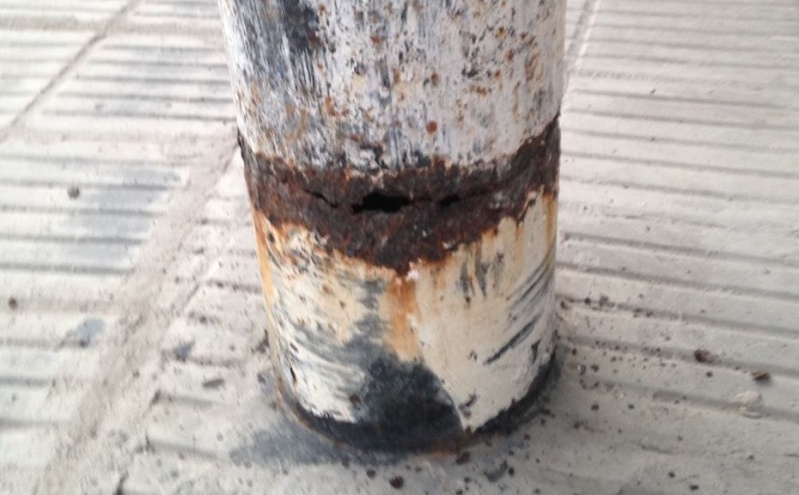Oxidado y con grietas en su parte inferior, el poste se encuentra en muy mal estado y aunque lo han repintado no se puede pasar por alto su degradación. "Está a punto de caerse", le manifestó un vecino del Mondongo a LAPLATA1.com.